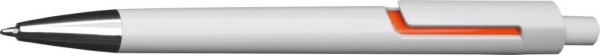 Biele plastové guľôčkové pero s farebnými časťami a jumbo náplňou. Pero má modrý atrament.