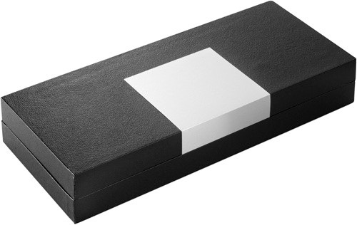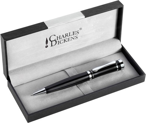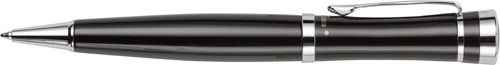 Kovové guľôčkové pero so strieborným lemovaním a otočným mechanizmom.