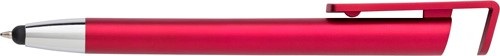 ABS guľôčkové pero s gumenou špičkou vhodné pre kapacitné obrazovky a spony, ktoré slúžia ako stojan na telefón. Modrý atrament.
