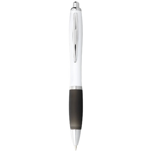 Biele guľôčkové pero Nash s farebným a mäkkým úchopom. Pero má modrý atrament. Materiál: ABS plast.