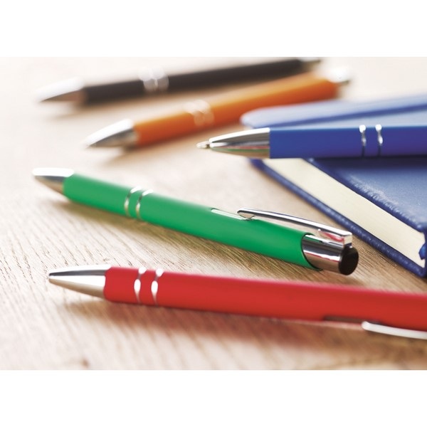 Guľôčkové pero v pogumovanom vzhľade s lesklými doplnkami.