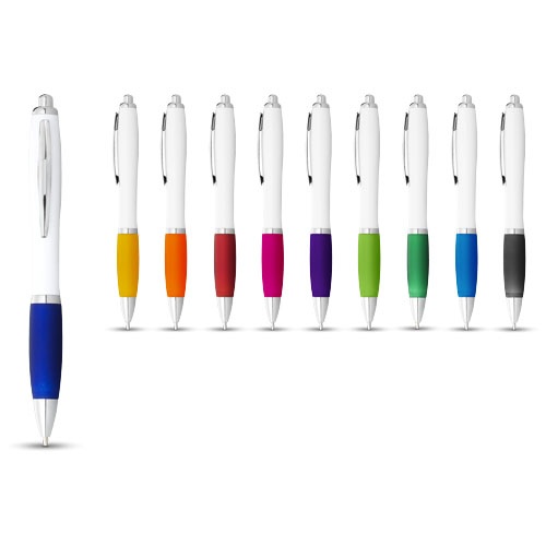 Biele guľôčkové pero Nash z ABS s farebným úchopom a s mechanizmom prítlačného typu. Pero má čierny atrament.