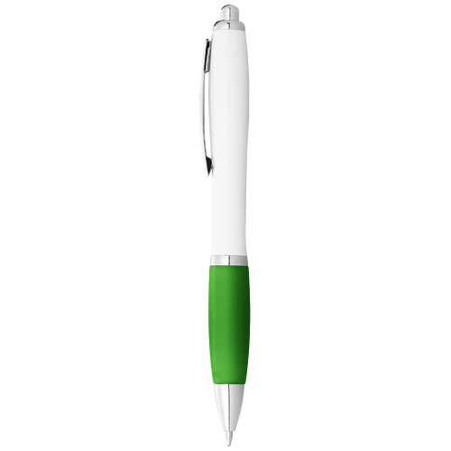 Biele guľôčkové pero Nash s farebným a mäkkým úchopom. Pero má modrý atrament. Materiál: ABS plast.
