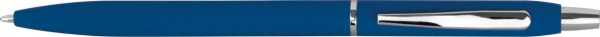 Štíhle kovové guľôčkové pero so strieborným klipom, gumeným povrchom a modrou náplňou.