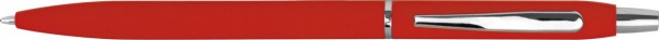 Štíhle kovové guľôčkové pero so strieborným klipom, gumeným povrchom a modrou náplňou.