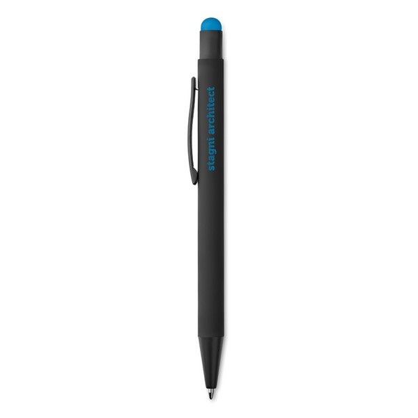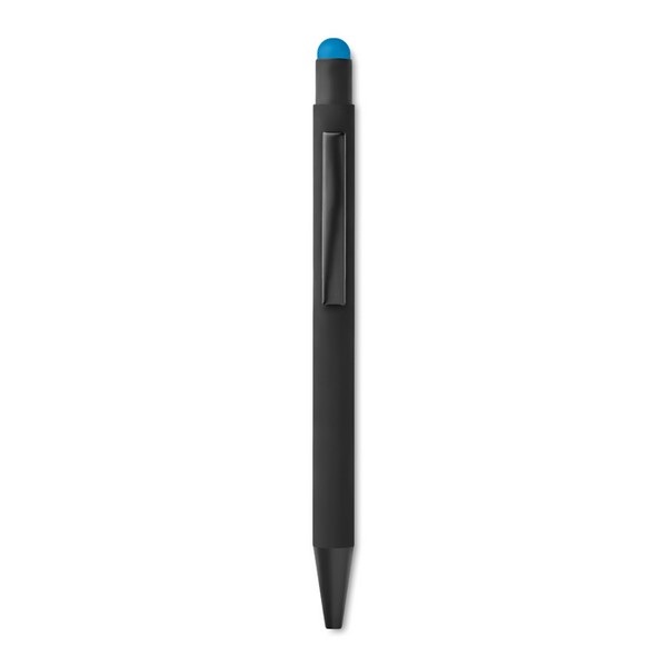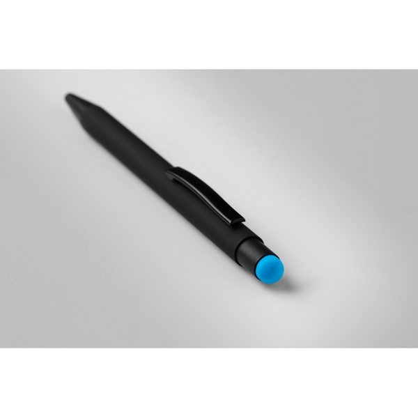 Hliníkové pero so stylusom. Logo má po vylaserování rovnakou farbou ako stylus. Modrá náplň.