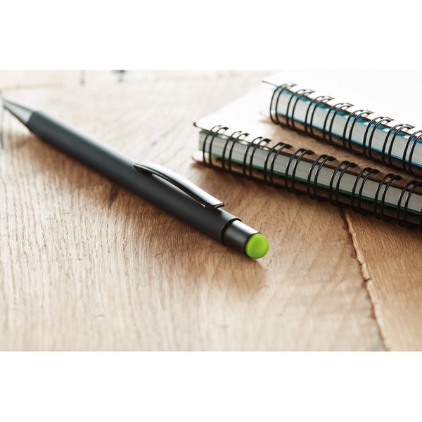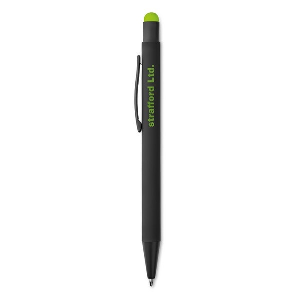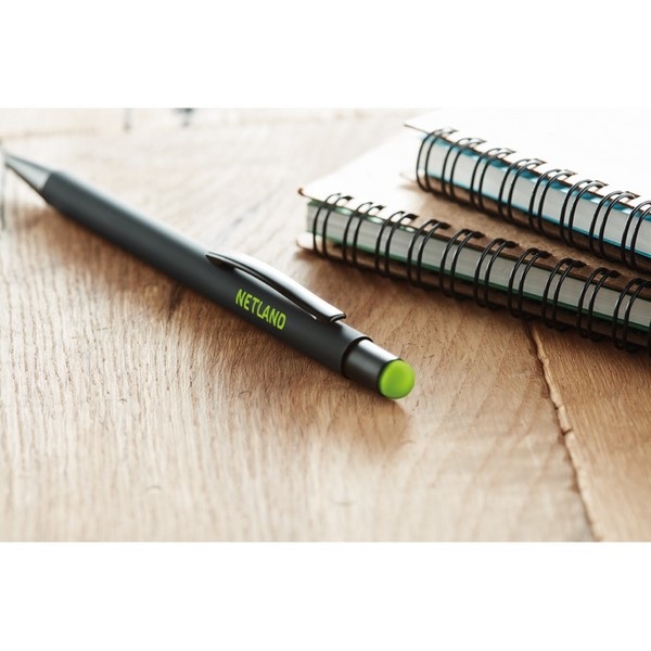 Hliníkové pero so stylusom. Logo má po vylaserování rovnakou farbou ako stylus. Modrá náplň.