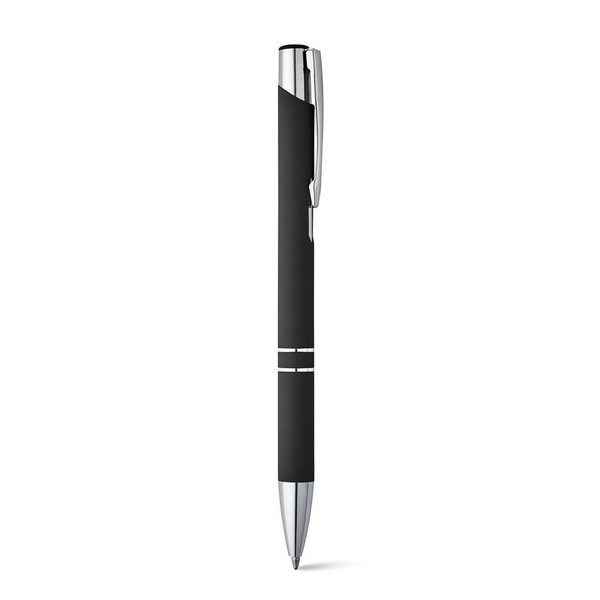 Hliníkové guľôčkové pero s farebným telom a gumenou úpravou. Čierna náplň.