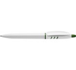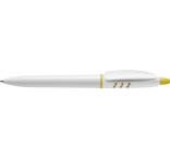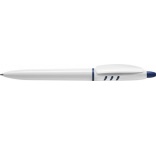 Plastové guľôčkové pero Stilolinea s bielym telom a farebnými detailmi. Modrý atrament. Dodávané s nemeckým atramentom Dokumental.