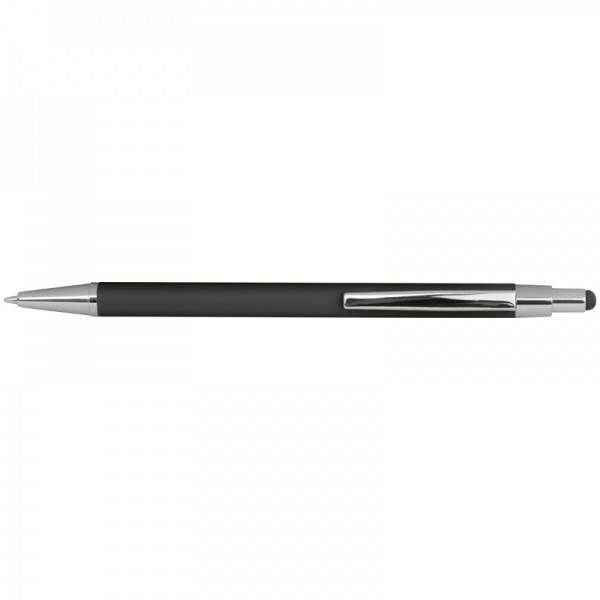 Tenké kovové guľôčkové pero s gumeným povrchom, modrou náplňou a stylusom.