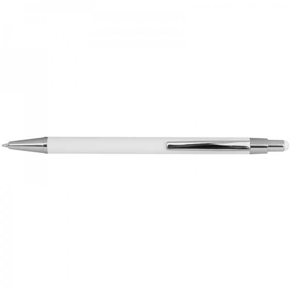Tenké kovové guľôčkové pero s gumeným povrchom, modrou náplňou a stylusom.