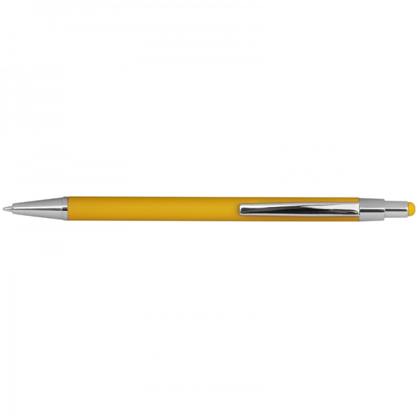 Tenké kovové guľôčkové pero s gumeným povrchom, modrou náplňou a stylusom.