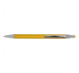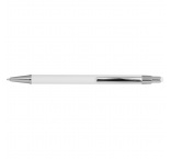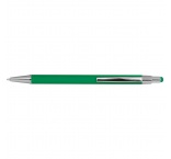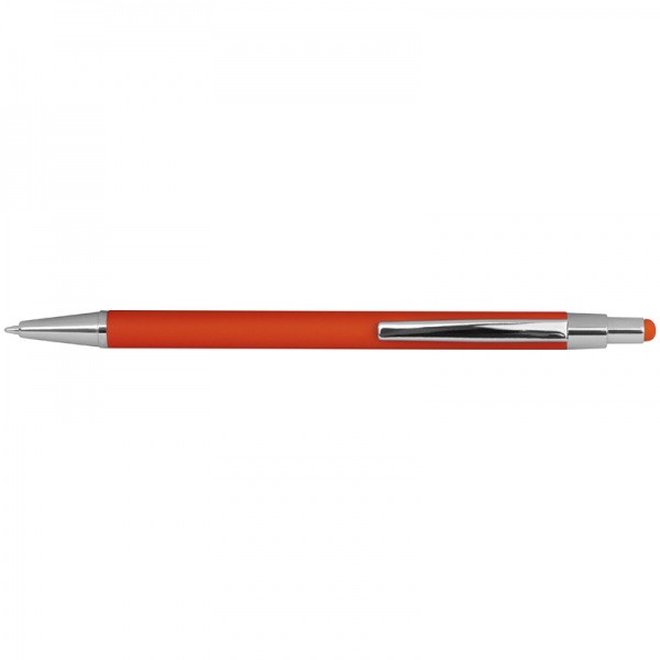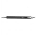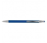 Tenké kovové guľôčkové pero s gumeným povrchom, modrou náplňou a stylusom.