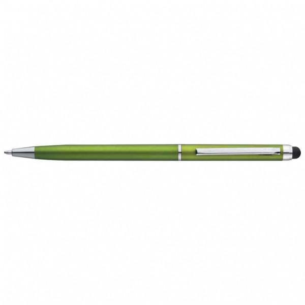 Plastové guľôčkové pero v elegantnom tenkom vyhotovení s modrou tuhou a s modernou dotykovou funkciou na ovládanie všetkých dotykových displejov.