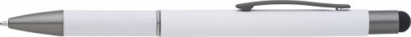 Hliníkové guľôčkové pero s detailom zvinutého papiera na rukoväti. Gumový hrot pre kapacitné obrazovky. Modrá náplň.