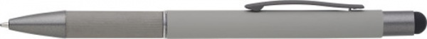 Hliníkové guľôčkové pero s detailom zvinutého papiera na rukoväti. Gumový hrot pre kapacitné obrazovky. Modrá náplň.
