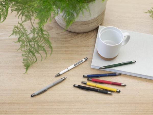 Hliníkové guľôčkové pero s detailom zvinutého papiera na rukoväti. Gumový hrot pre kapacitné obrazovky. Modrá náplň.