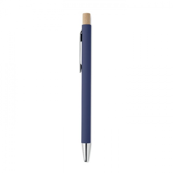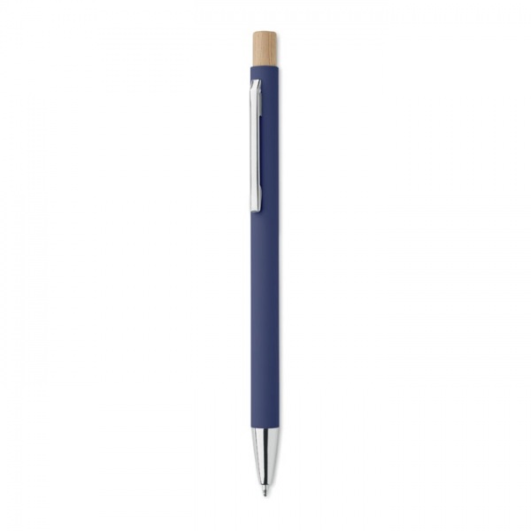 Guľôčkové pero z recyklovaného hliníka. Strieborný hrot a klip. Modrá náplň.