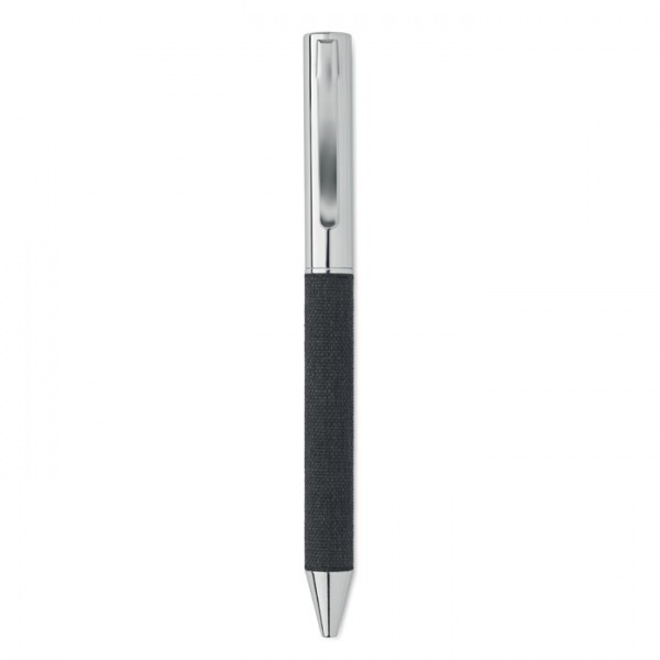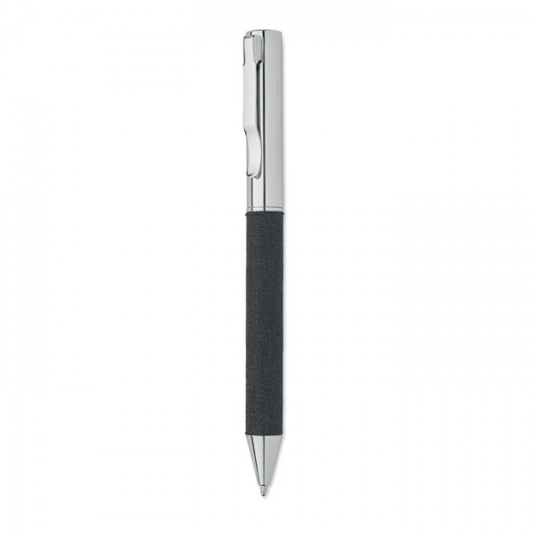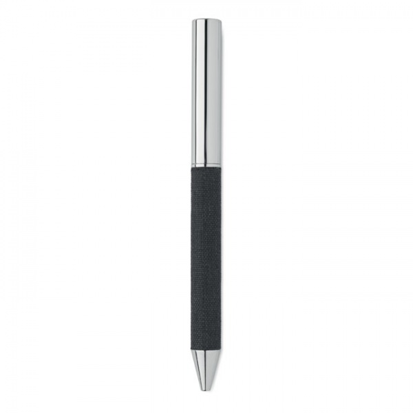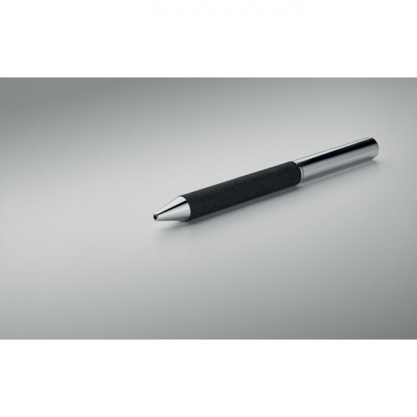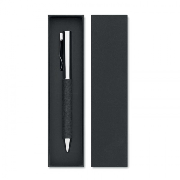 Kovové guľôčkové pero s RPET polyesterovým detailom v darčekovej krabičke. Modrý atrament.