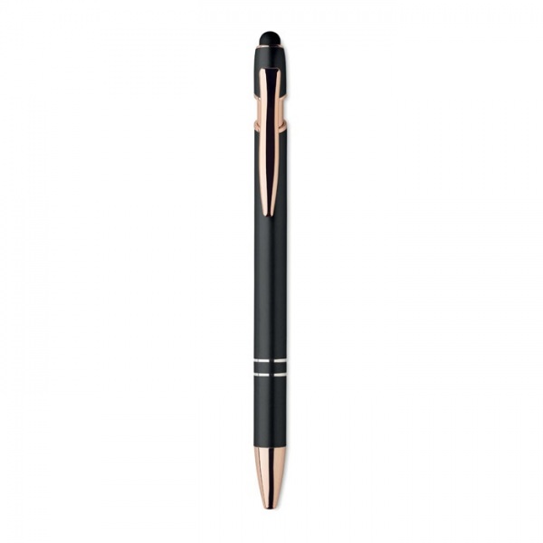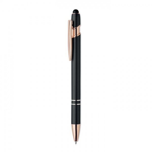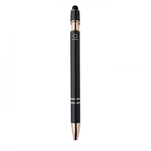 Guľôčkové pero z recyklovaného hliníka s detailmi z ružového zlata. Modrá náplň.