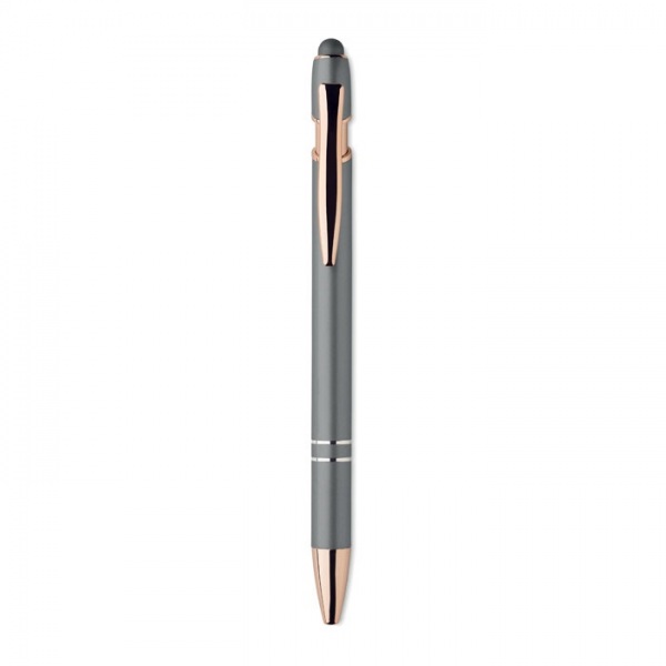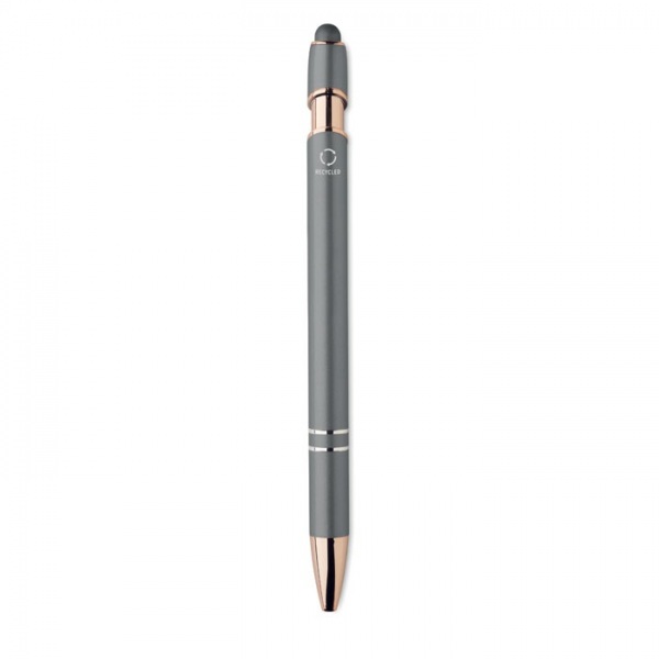Guľôčkové pero z recyklovaného hliníka s detailmi z ružového zlata. Modrá náplň.