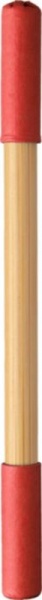 Bambusová nekonečná ceruzka a guľôčkové pero. Jedna strana s nekonečnou ceruzkou a druhá s guľôčkovým perom, obe s farebným kartónovým vrchnákom. Modrá náplň.