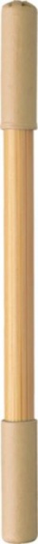 Bambusová nekonečná ceruzka a guľôčkové pero. Jedna strana s nekonečnou ceruzkou a druhá s guľôčkovým perom, obe s farebným kartónovým vrchnákom. Modrá náplň.