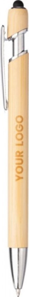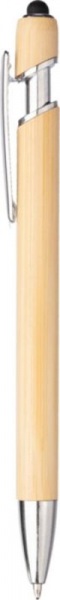 Bambusové guľôčkové pero s hrotom stylusu a kovovou sponou. Modrá náplň.
