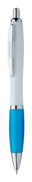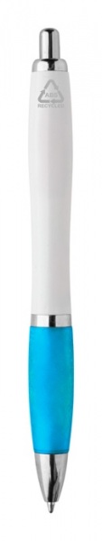 Guľôčkové pero z recyklovaného ABS plastu s bielym telom, farebným úchopom a chrómovanými časťami. S modrou náplňou.