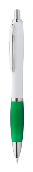 Guľôčkové pero z recyklovaného ABS plastu s bielym telom, farebným úchopom a chrómovanými časťami. S modrou náplňou.