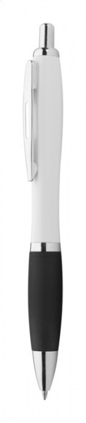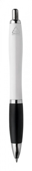 Guľôčkové pero z recyklovaného ABS plastu s bielym telom, farebným úchopom a chrómovanými časťami. S modrou náplňou.