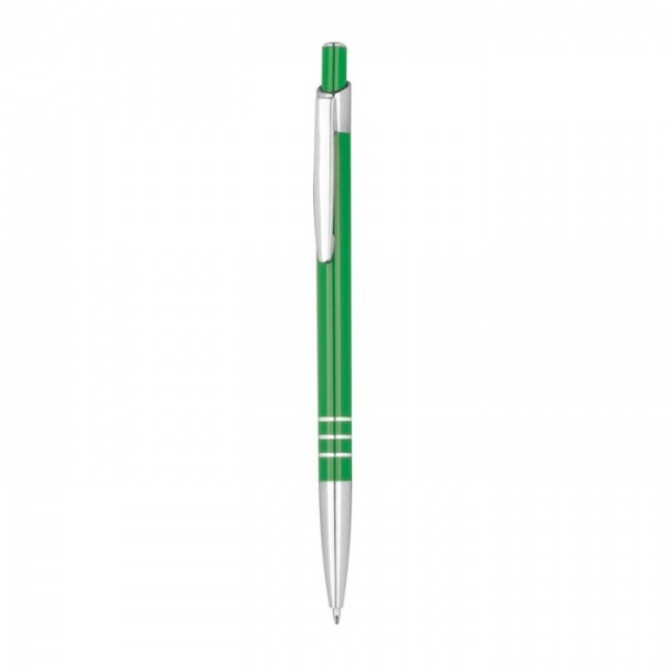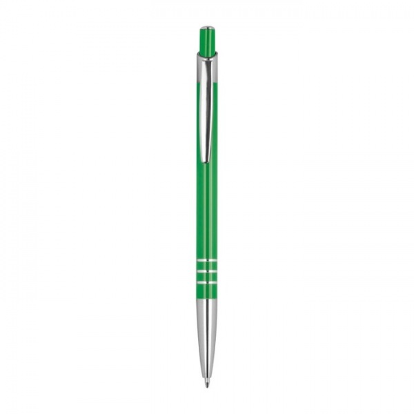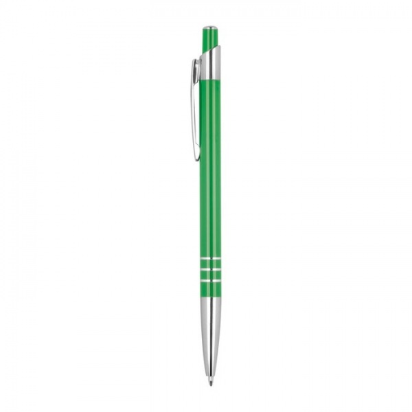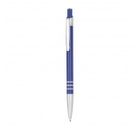 Guľôčkové pero v štíhlom prevedení z recyklovaného hliníka, s modrou náplňou a tromi dekoratívnymi prstencami.