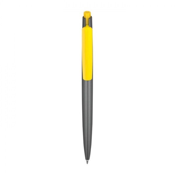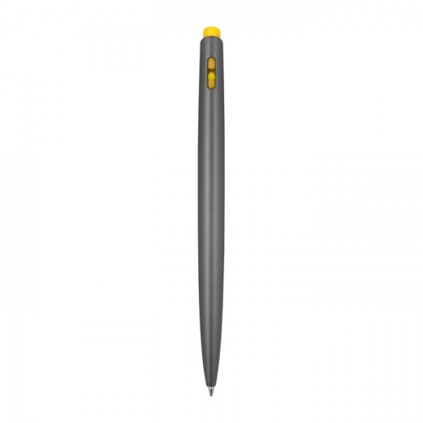 Stláčacie guľôčkové pero z recyklovaného plastu, s farebnými aplikáciami a modrou náplňou.
