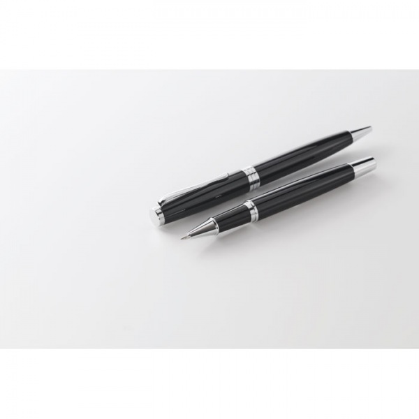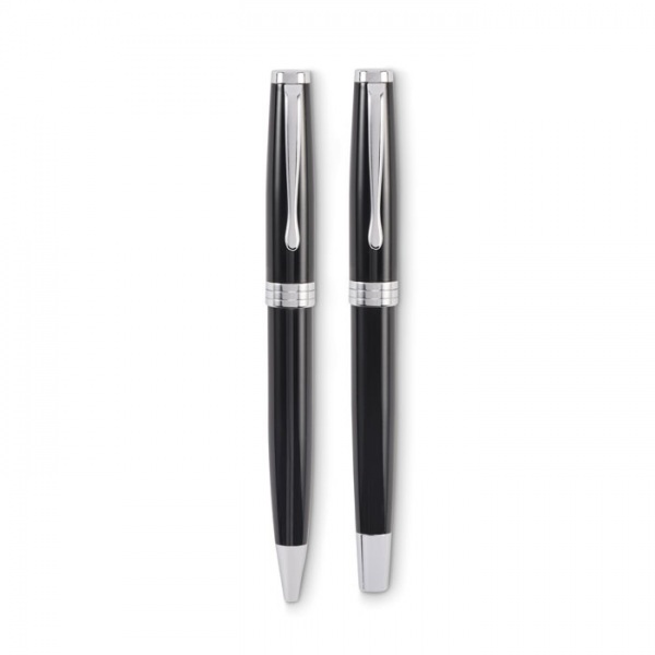 Sada otočného guľôčkového pera a rolleru. Modrý a čierny atrament. Dodávané v darčekovej krabičke.
