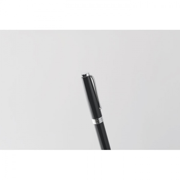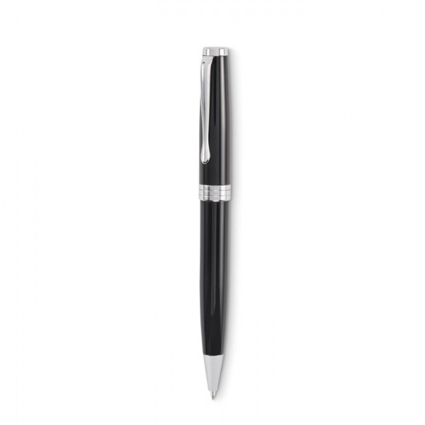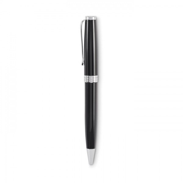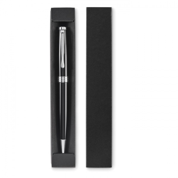 Otočné guľôčkové pero s telom z recyklovanej nehrdzavejúcej ocele. Modrý atrament. Dodávané v darčekovej krabičke.