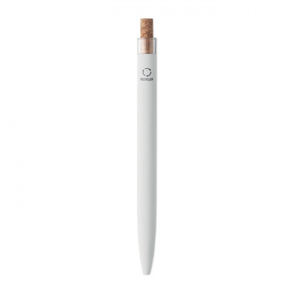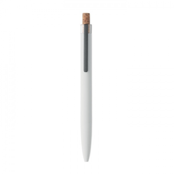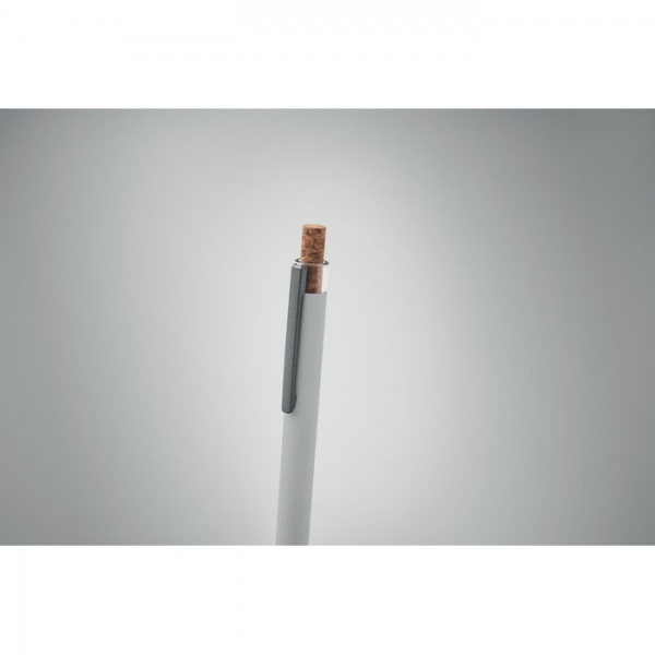 Guľôčkové pero z recyklovaného hliníka s korkovým gombíkom a kovovým klipom. Modrý atrament.