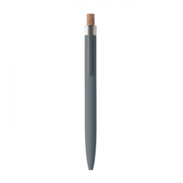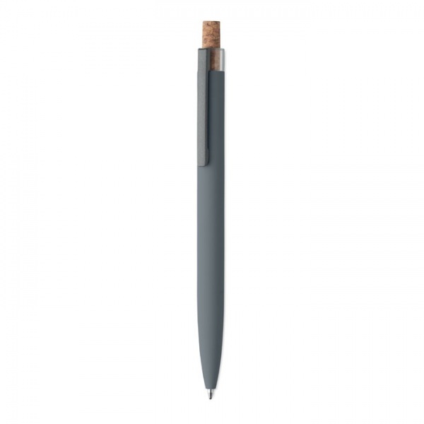 Guľôčkové pero z recyklovaného hliníka s korkovým gombíkom a kovovým klipom. Modrý atrament.
