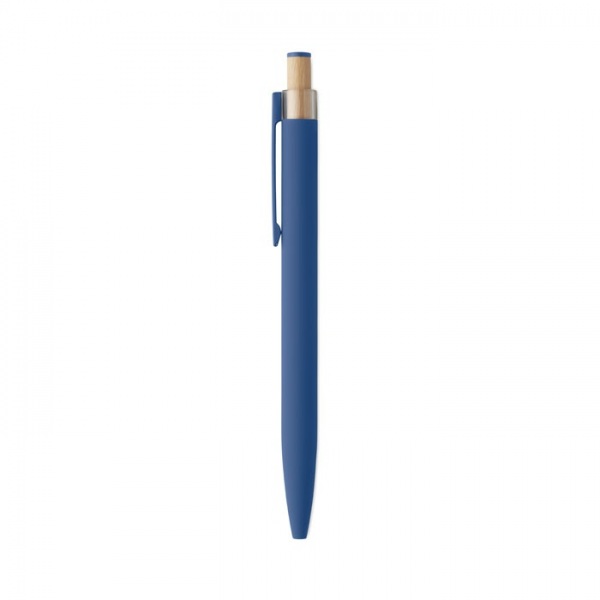 Guľôčkové pero z recyklovaného hliníka s bambusovým tlačidlom, farebne zladeným detailom a kovovým klipom v rovnakom prevedení. Modrý atrament.