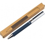 Otočné guľôčkové pero z mosadze a rPET s kovovým klipom a úchopom. Má otočný mechanizmus a logo rPET na tele. Jednotlivo balené v hnedej kartónovej škatuli. Modrá náplň.