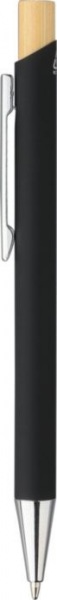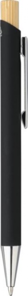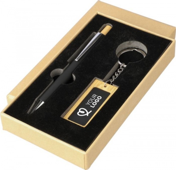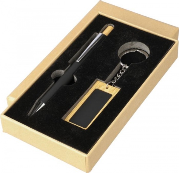 Sada obsahuje guľôčkové pero (modrá náplň) z bambusu a pogumovaného recyklovaného hliníka a kľúčenku z bambusu a pogumovanej nehrdzavejúcej ocele. Zrkadlový efekt po laserovom gravírovaní. Balené v kraftovej krabičke so zamatovou vložkou.