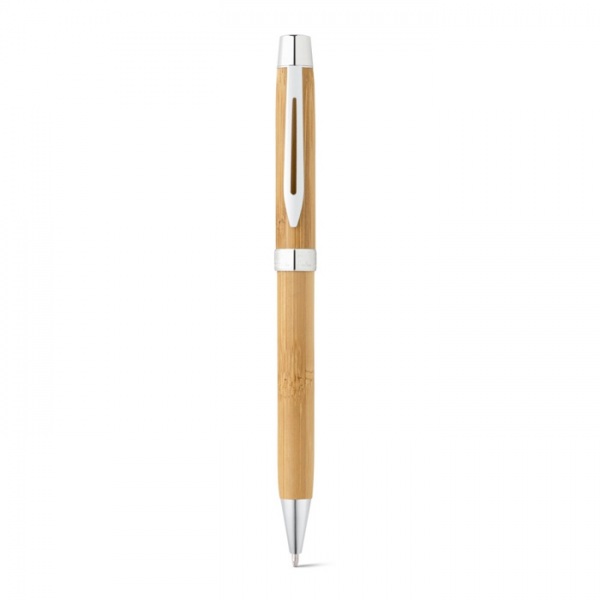Bambusové guľôčkové pero s kovovým klipom. Guľôčkové pero má modrý atrament a otočný mechanizmus. Dodávané v bambusovej darčekovej krabičke s posuvným vekom a obalom zo 100% recyklovaného papiera.