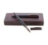 Elegantná sada kovového guľôčkového pera a rollera s pruhovaným telom, farebnými akcentmi a lesklými detailmi vo farbe antracit. Vo farebne zladenej darčekovej krabičke a s modrou náplňou. Produkt značky André Philippe.