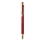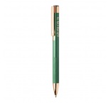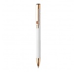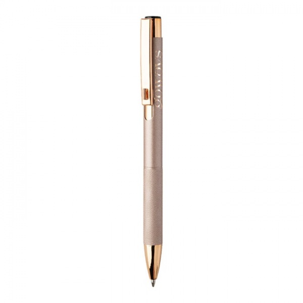 Guľôčkové pero z recyklovaného hliníka s matným telom, textúrovaným úchopom a detailmi ružového zlata. So špeciálnym povrchom na zrkadlové laserové gravírovanie vo farbe ružového zlata. S modrou náplňou.