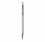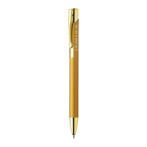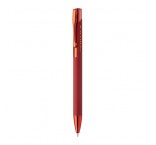 Guľôčkové pero z recyklovaného hliníka s matným telom, textúrovaným úchopom a detailmi ružového zlata. So špeciálnym povrchom na zrkadlové laserové gravírovanie vo farbe ružového zlata. S modrou náplňou.