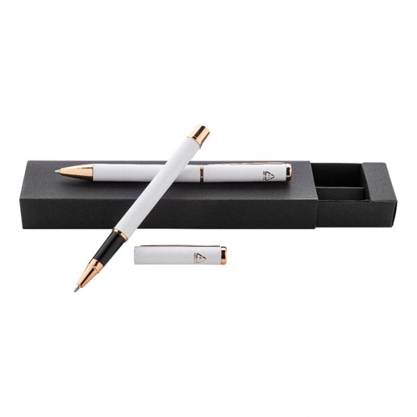 Súprava pier z recyklovaného hliníka s guľôčkovým perom a rollerom s pogumovaným povrchom a detailmi ružového zlata. So modrou náplňou.