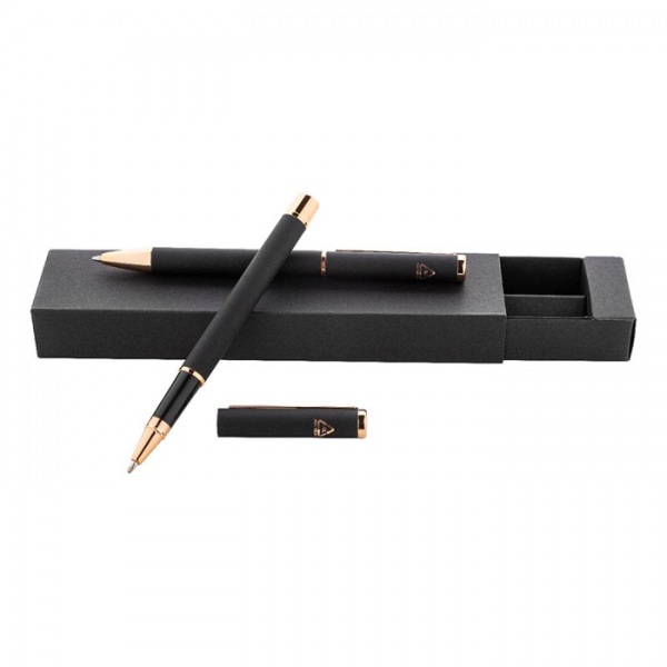 Súprava pier z recyklovaného hliníka s guľôčkovým perom a rollerom s pogumovaným povrchom a detailmi ružového zlata. So modrou náplňou.