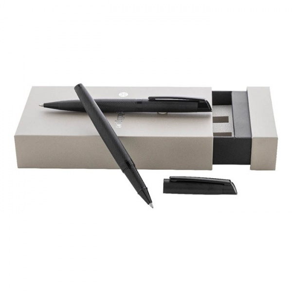 Elegantná sada kovového guľôčkového pera a rollera s diagonálne textúrovaným telom. V dvojfarebnej darčekovej krabičke s modrou náplňou. Produkt značky André Philippe.