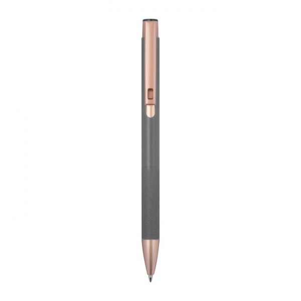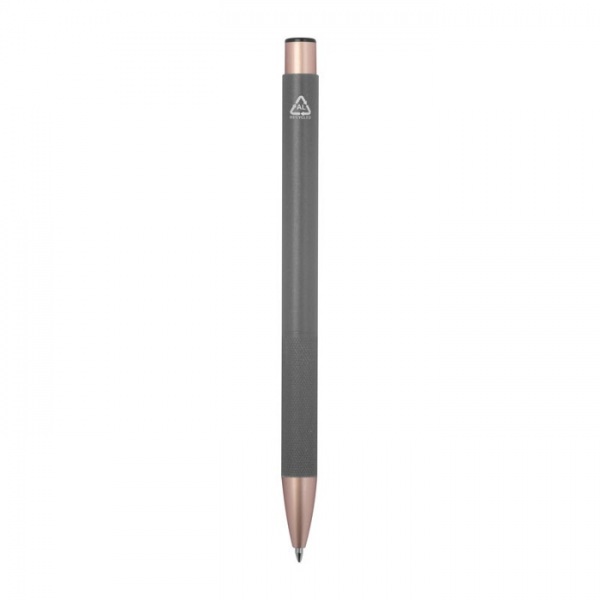 Guľôčkové pero z recyklovaného hliníka s matným povrchom, ružovo-zlatými detailmi, modrou náplňou a úchopom s diamantovým vzorom