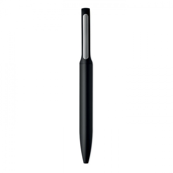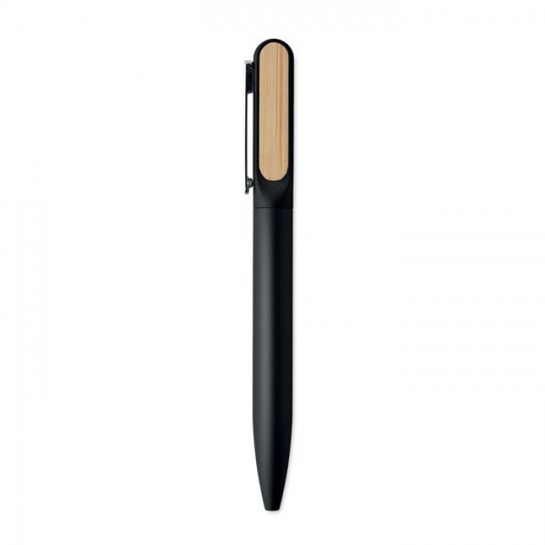 Otočné guľôčkové pero s hlavňou z recyklovaného hliníka, otočnou časťou z recyklovaného ABS a kovovým klipom s bambusovými detailmi. Modrý atrament.
