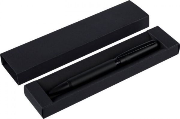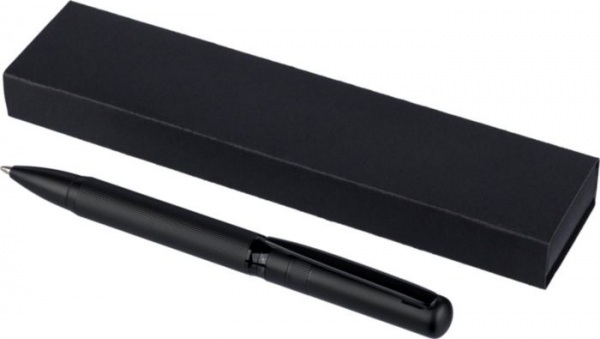 Otočné guľôčkové pero Ecobrass s kovovým klipom a otočným mechanizmom vo farbe papiera. Vybavené nemeckou modrou náplňou Dokumental s približnou dĺžkou písania 1 000 metrov. Jednotlivo balené v čiernej posuvnej krabičke.